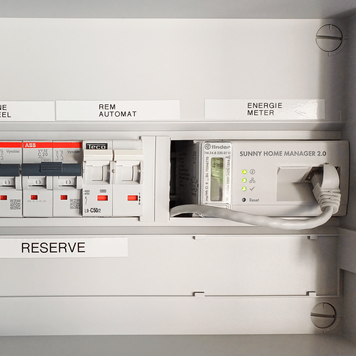 Daarnaast installeerden we de SMA Sunny Home Manager 2.0, een slimme energiemeter die ook fungeert als EMS-systeem (Energy Management System). Deze energiemeter volgt het energieverbruik en de productie voortdurend op en stuurt het gebruik automatisch bij om zo efficiënt mogelijk met de opgewekte stroom om te gaan.